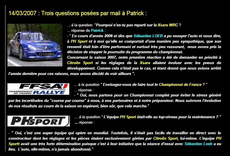 clic >>> Trois questions à Patrick après les essais de 307 WRC ( Adobe Reader ) Soirée Passion 2007